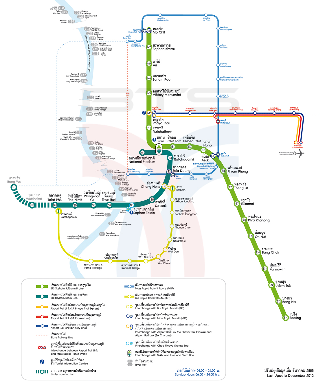 Train Trip dimulai langsung saat saya mendarat di Suvarnabhumi Airport, sehabis ganti sim card supaya bisa tetep twitteran & pathan, saya langsung turun ke B1 utk akses Train dari airport to city of Bangkok pake SRT (The State Railway of Thailand). Dari Suvarnabhumi Airport kita bisa turun di Phaya Thai Station, untuk langsung ganti Train ke BTS (Bangkok Skytrain), Nah kalo udah sampe BTS, kalian udah aman tuh bisa jalan kemana2 di Bangkok, terserah. Below the BTS Map for your information :