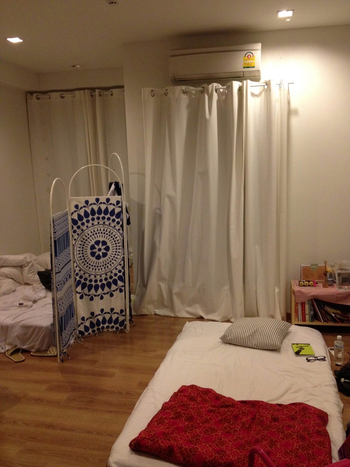 Sore menjelang magrib, akhirnya saya bertemu dengan host couch saya di Bangkok, namanya Alderina, anak Indonesia juga sih, dia kerja di Digital Agency di Bangkok menghandle Ford Global untuk content Indonesia. Anak ini emang asik dan gak nanggung kalo tinggal, dia pilih apartement utk tempat tinggal di Bangkok, lengkap dengan furniture seperti kasur, lemari & dapur. Fasilitasnya juga gak kalah asik, ada gym & swimming pool-nya. Kurang lengkap apa lagi coba buat sekedar "Couch".. Oooh I'm so fucking lucky bastard!