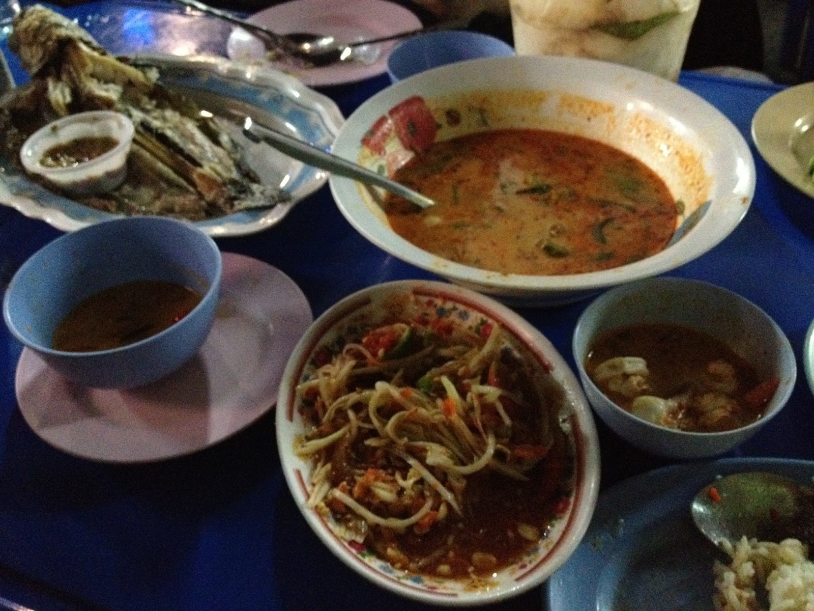 Sampe di lokasi makan malam, kami pesan beberapa makanan khas Thailand, off course Tom Yum & Thai Mango Salad gak lupa dipesen. Sejujurnya, makan di kawasan Hawkers gini seru bgt, alasannya: pertama lebih murah, kedua makanananya lebih enak, ketiga lebih berasa keren aja backpackeran-nya. Hahaha.. Oiya, karena ini kawasan Hawkers pinggir jalan, jadi sebenarnya banyak makanan / cemilan yg unik2 buat dicoba, dari mulai goreng2an, rebus2an, sampe babi2an.. *wink*. Setelah kenyang kita akhirnya balik ke "Couch" utk istirahat. Besok paginya saya berecana untuk jalan2 liat Giant Buddha di Wat Pho.