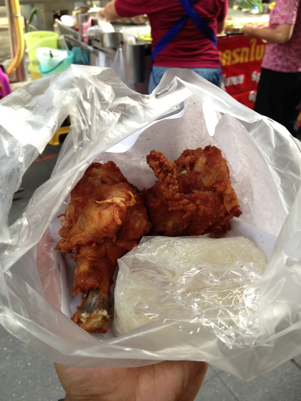 Pagi saya pisah dengan si host di gerbang apartement, dia jalan ke kantor saya pergi ke post office buat kirim post card ke You Know Who. Setelah itu saya lanjut jalan untuk cari sarapan, cosidering budget utk trip yg masih panjang, saya memilih utk cari makan pinggiran aja. Ketemu Fried Chicken gede bgt yg (more likely ayamnya disuntik gendut) enak banget & murah. Kurang lebih harganya 36 THB aja, udah dapet 2 paha bawah & 1 nasi ketan. Nih gambarnya :